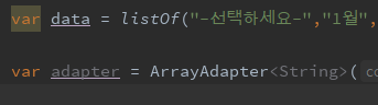 스피너 사용시 listOf 를 이용하여 만든 데이터를 스피너와 연결하기 위해서는 ArrayAdapter 클래스를 이용하여 별도의 변수를 지정하여 저장 해야한다.