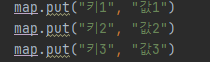 Map에 값을 입력하기 위해서는 put()함수를 이용합니다. 입력시에는 키와 값을 함께 입력합니다.