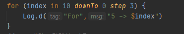앞에서는 작은수에서 큰수로 값이 증가 하였지만 downTo를 사용하게 되면 큰수에서 작은수로 값이 감소하면서 반복 됩니다.
