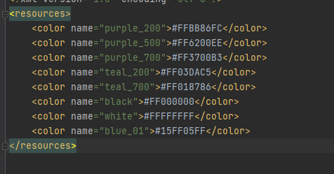 위치는 res -> values -> colors.xml 으로 기본적으로 추가되어 있습니다. xml 소스안에 아래처럼 입력합니다.
