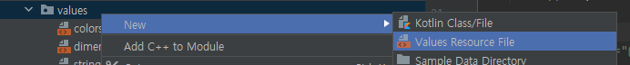 dimens.xml파일은 기본적으로 제공되지 않아 직접 생성 하여 줍니다. 경로상 res -> values를 오른쪽 클릭 하여 나타나는 메뉴에서 아래처럼 선택하여 만듭니다. 이름은 dimes로 입력합니다.
