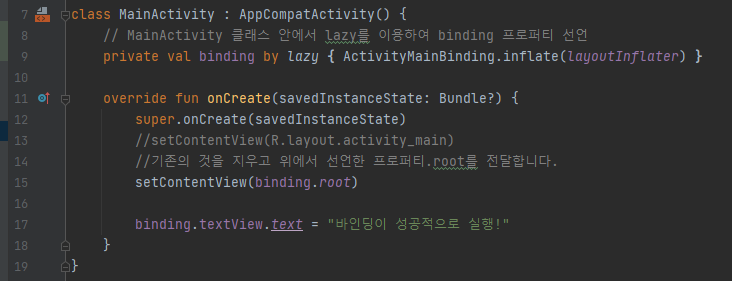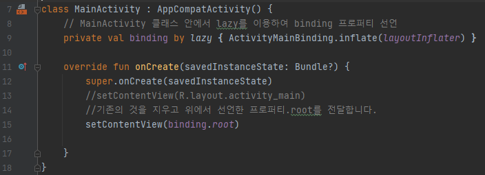 그리고 기존의 setContentView는 지우고 binding.root를 전달합니다.