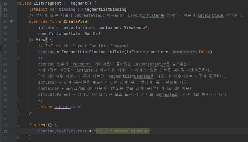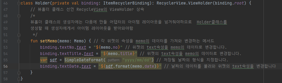 프레그먼트는 Adapter에서 사용하는 방법과 비슷합니다. Fragment클래스안에서 먼저 lateinit으로 선언합니다.