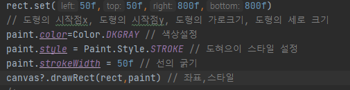 drawRect는 사각형을 Rect클래스에 좌표의 정보를 받아 사용한다.