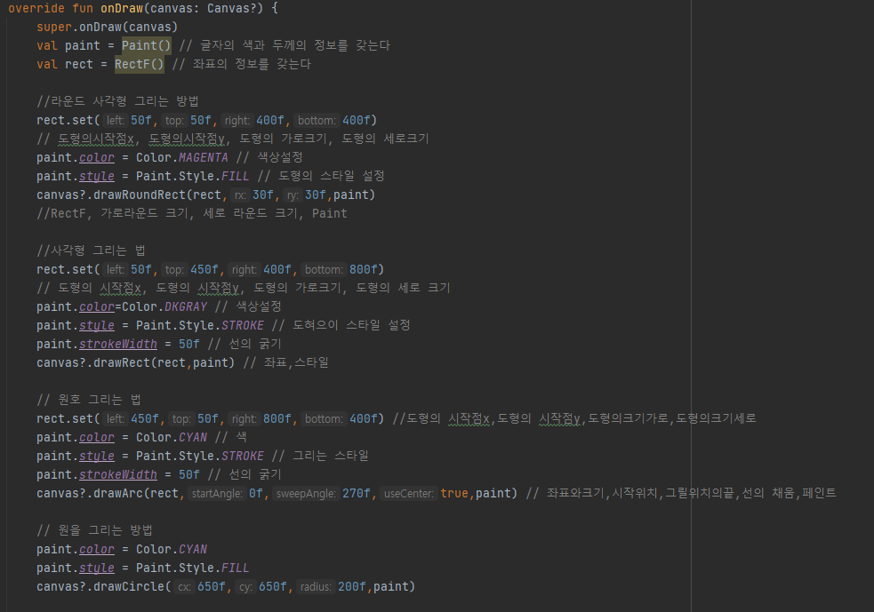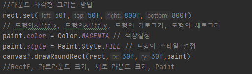 drawRoundRect(RectF, rx, ry, Paint) - 각 모서리에 라운드가 적용된 사각형