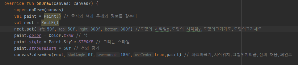 drawArc의 경우 좌표의 정보를 Paint처럼 RectF로 받아 그린다.
