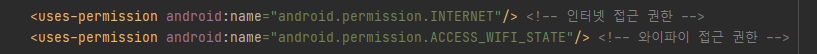 권한 명세시 사용하는 태그는 <uses-permission/> 태그를 포함하여 필요한 권한을 명세합니다.