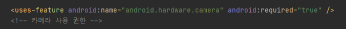 이렇게 기능 명세가 작성이 되면 해당기능의 사용 여부로 플레이스토어 검색 조건이 됩니다. 즉 카메라의 기능을 사용하는 순간 자동으로 AndroidManifest.xml에 명세가 되는데 만약 해당 기기에 카메라가 없다면 해당 어플을 검색 할 수 없습니다. 이런경우 검색이 가능하게 하기위해서 required의 속성을 false로 변경을 하면 검색이 됩니다. 하지만 카메가 기능이 없는 기기가 어플을 실행하면 관련 코드에서 오류가 발생하여 예외처리가 필요합니다.