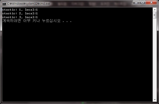 static 변수는 지역변수와 전역변수 둘의 성질을 같이 가지고 있다고 보면 된다. static 변수는 지역변수처럼 선언된 함수내에서만 사용이 가능하며,단 한번만 초기화를 할뿐 전역 변수처럼 프로그램이 종료될때까지 메모리공간에 존재하게된다. 다른점은 지역변수와는 달리 해당 함수가 반환을 하더라도 소멸되지 않는다. 이처럼 다른 함수에서는 쓸수없지만 해당함수 내에서는 static 변수는 프로그램이 종료를 하기전까진 소멸되지 않는다. 아래와 같은 예제를 살펴보자결과를 보면알겠지만 num1은 static이라 한번 초기화될 뿐 값이 사라지지 않고 계속 유지 되지만.num2는 simpleFunc 함수를 실행 할때마다 초기화되어 값이 그대로이다.#includevoid simpleFunc(void); int main(..